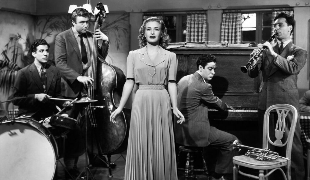 La prima volta che sentiamo il tema di Blues in the Night nel film è in una delle scene più importanti, quando i jazzisti del locale, dopo aver preso a cazzotti un cliente che aveva osato fare al pianista una richiesta poco dignitosa (“Suonala, scimmia! I’m forever blowing bubbles!”), finiscono in prigione e si mettono a discutere su che tipo di musica vogliano suonare.